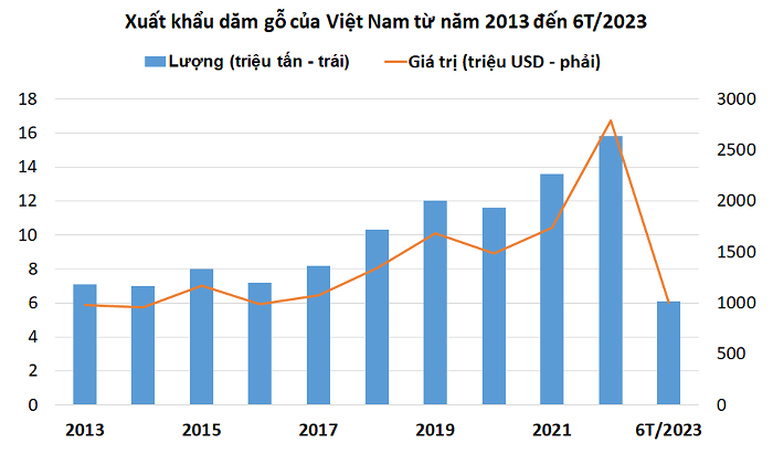 Trong đó, xuất khẩu dăm gỗ sang Nhật Bản trong nửa đầu năm 2023 đạt 316,5 triệu USD, tăng 5,5% so với cùng kỳ năm 2022, chiếm gần 39% tổng trị giá xuất khẩu gỗ và sản phẩm từ gỗ sang thị trường này.