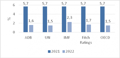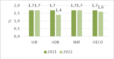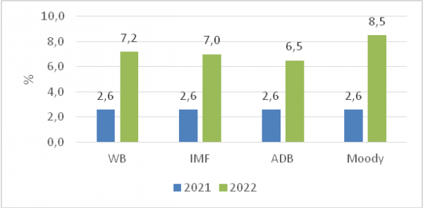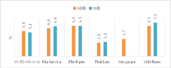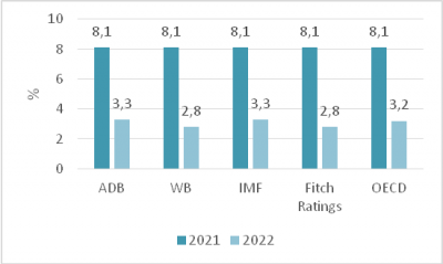 WB và IMF dự báo tăng trưởng kinh tế năm 2022 của Việt Nam lần lượt là 7,5% và 7%. ADB giữ nguyên mức 6,5% so với dự báo đưa ra vào tháng 4/2022.