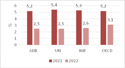 Tổ chức Hợp tác và Phát triển kinh tế dự báo tăng trưởng của thế giới trong năm 2022 đạt 3%, giữ nguyên so với dự báo đưa ra tháng 6/2022. Báo cáo cập nhật Triển vọng phát triển kinh tế tháng 9/2022 của Ngân hàng Phát triển châu Á (ADB) điều chỉnh giảm mạnh dự báo tăng trưởng kinh tế của một số nền kinh tế lớn so với dự báo đưa ra trong tháng 4/2022, cụ thể dự báo tăng trưởng GDP của Hoa Kỳ giảm từ 3,9% xuống còn 1,6%, khu vực đồng Euro giảm từ 3,3% xuống 2,5%, Nhật Bản giảm từ 2,7% xuống 1,4%, Trung Quốc giảm từ 5,0% xuống còn 3,3%.