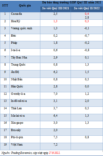 Theo Trading Economics, dự báo tăng trưởng QIII/2022 so với cùng kỳ năm trước của In-đô-nê-xi-a, Malaysia, Philippin, Thái Lan, Singgapore lần lượt đạt 3,1%, 6,4%, 7,5%, 3,7%, 3%. Tăng trưởng quý III/2022 so với quý II/2022 của các quốc gia trên lần lượt là 2%, 1,3%, 0,8%, 0,5% và 1,3%.