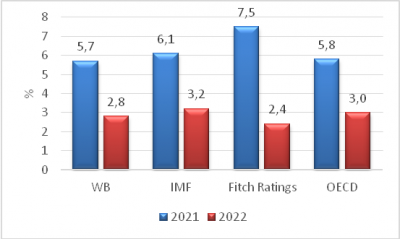 Fitch Ratings đã cắt giảm dự báo tăng trưởng GDP thế giới năm 2022 xuống chỉ còn 2,4%, điều chỉnh giảm 0,5 điểm phần trăm so với dự báo trong tháng 6/2022. Báo cáo Triển vọng kinh tế thế giới tháng 7/2022 của Quỹ Tiền tệ Quốc tế nhận định tăng trưởng toàn cầu năm 2022 đạt 3,2%, thấp hơn 0,4 điểm phần trăm so với dự báo trong tháng 4/2022.