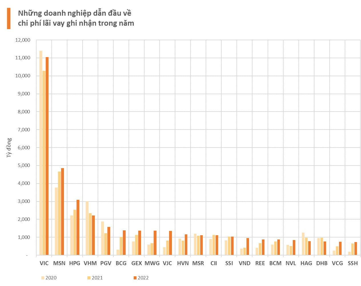 Chi phí lãi vay phát sinh (ghi nhận vào kết quả kinh doanh) trong năm của Vingroup là 11.052 tỷ đồng, cao nhất toàn thị trường và gấp 2,3 lần doanh nghiệp xếp thứ 2. So với cùng kỳ năm 2021, chi phí lãi vay của Vingroup tăng gần 20%.