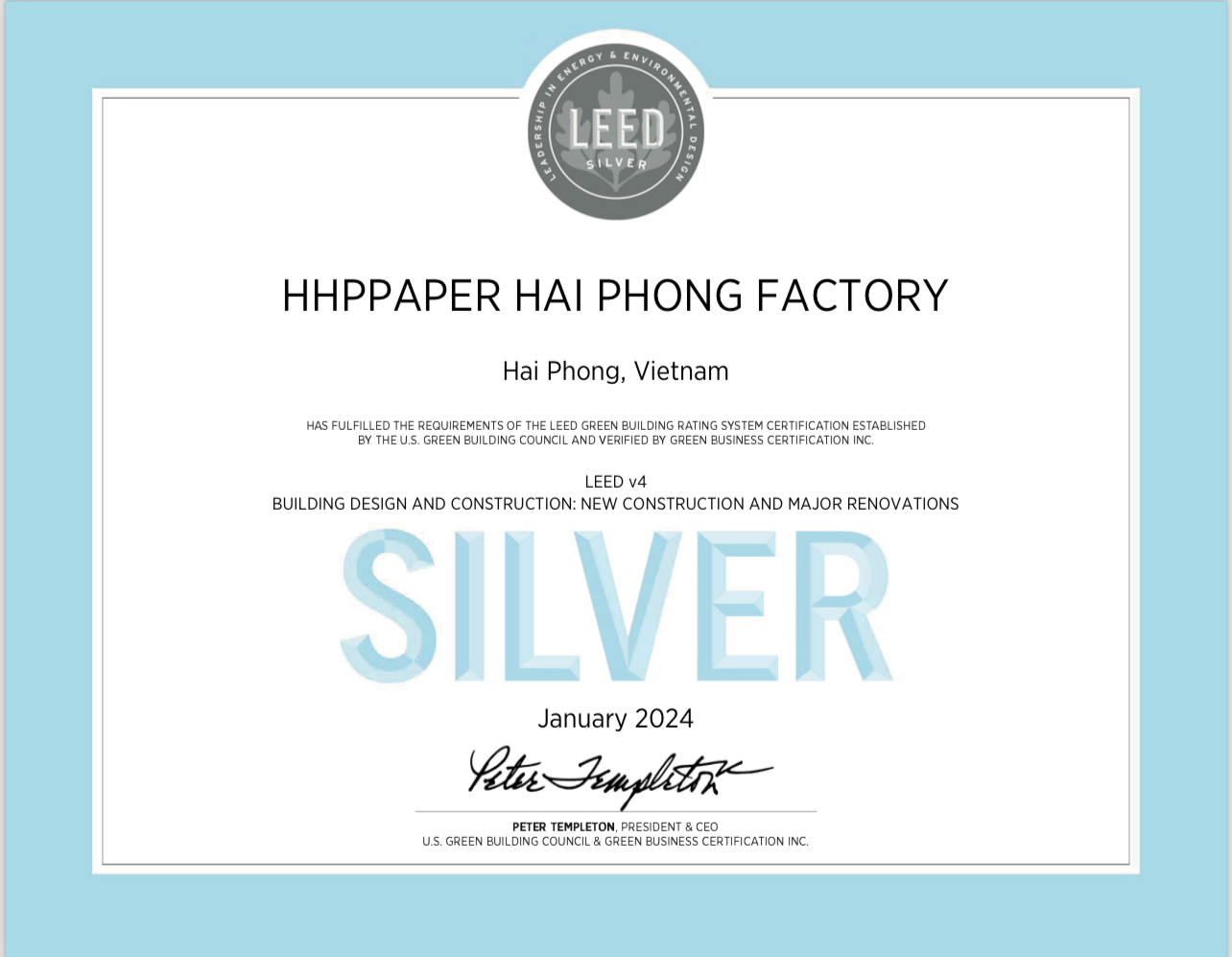 Nhà máy HHPPaper HẢI PHÒNG đã được Hội đồng Công trình xanh Hoa Kỳ (U.S. Green Building Council) cấp chứng nhận LEED SILVER (Leadership in Energy and EnvironmentalDesign) vào tháng 01 năm 2024.