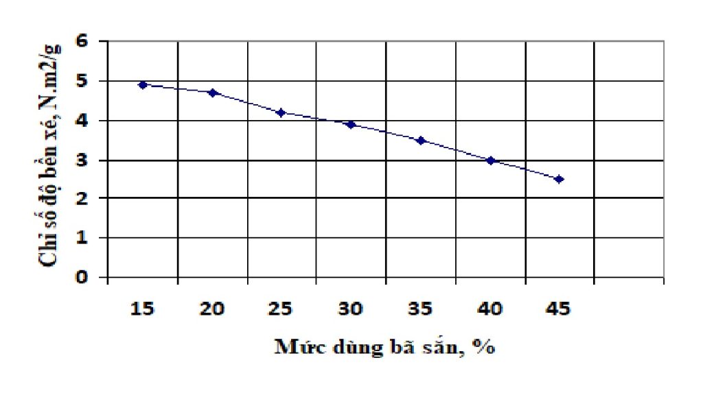 Kết quả thực nghiệm cho thấy rằng khi tăng mức dùng bã sắn thì độ bền xé giảm, điều đó có thể xét đến sự có mặt của một lượng xơ sợi ngắn của bã sắn sẽ làm cho độ bền xé giảm. Với mức dùng bã sắn thấp thì độ bền xé giảm nhẹ, mức độ giảm sẽ tăng khi tăng mức dùng bã sắn, và khi tăng mức dùng lên trên  35 % thì độ bền xé giảm qua mức cho phép.
