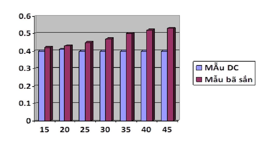 Để khảo sát ảnh hưởng của bã sắn tới độ dày của giấy, nhóm nghiên cứu đã tiến hành các thực nghiệm với các mấu khác nhau. Mẫu đối chứng là mẫu không sử dụng bã sắn và các mẫu dùng bã sắn với các mức dùng khác nhau, các mẫu được thực hiện ở cùng một điều kiện độ nghiền, xeo cùng một định lượng và các chế độ công nghệ ép, sấy như nhau. Kết quả xác định độ dày và khối lượng riêng được thể hiện ở đồ Hình 4: