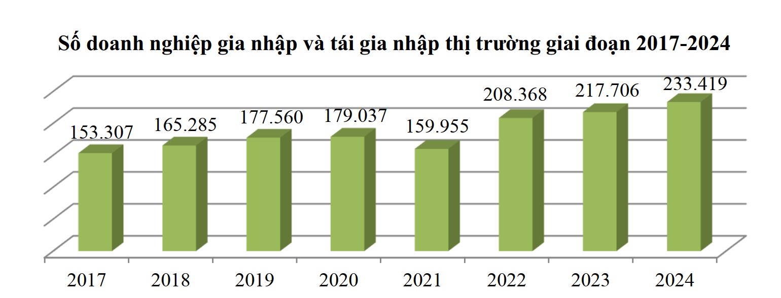 Tính chung số doanh nghiệp trở lại hoạt động và đăng ký mới trong năm 2024 là 233.419 doanh nghiệp. Bình quân một tháng có thêm 19.452 doanh nghiệp thành lập mới và quay trở lại hoạt động.