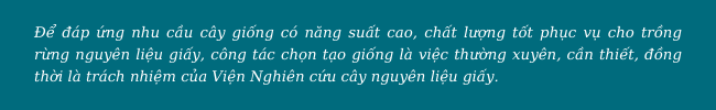 Thạc sĩ Hoàng Ngọc Hải, chủ nhiệm nhiệm vụ cho biết: muốn kinh doanh cây nguyên liệu giấy đạt hiệu quả cao thì giống là nhân tố chủ yếu ảnh hưởng đến năng suất, chất lượng cây gỗ. Chọn tạo giống là biện pháp rất quan trọng để đạt năng suất cao. Với các chương trình trồng rừng, muốn đạt thành công thì việc đầu tiên không thể thiếu là chọn giống cây trồng thích hợp.