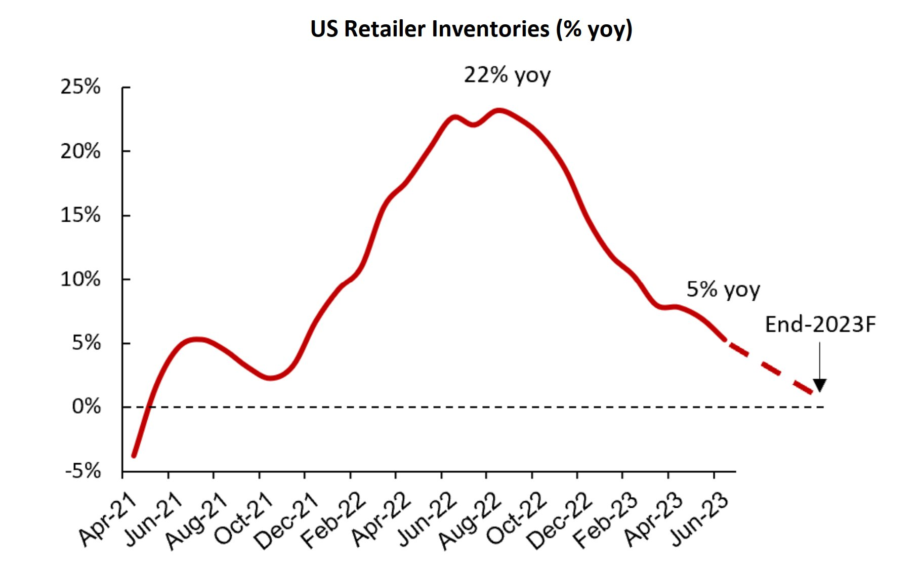 Điều này dẫn đến việc các nhà bán lẻ Hoa Kỳ đã cắt giảm đơn đặt hàng tại các nhà máy ở Việt Nam trong năm nay do lượng hàng tồn kho quá lớn. Đây cũng là nguyên nhân cho việc xuất khẩu của Việt Nam sang Mỹ trong 7 tháng đầu năm 2023 giảm hơn 20% so với cùng kỳ.